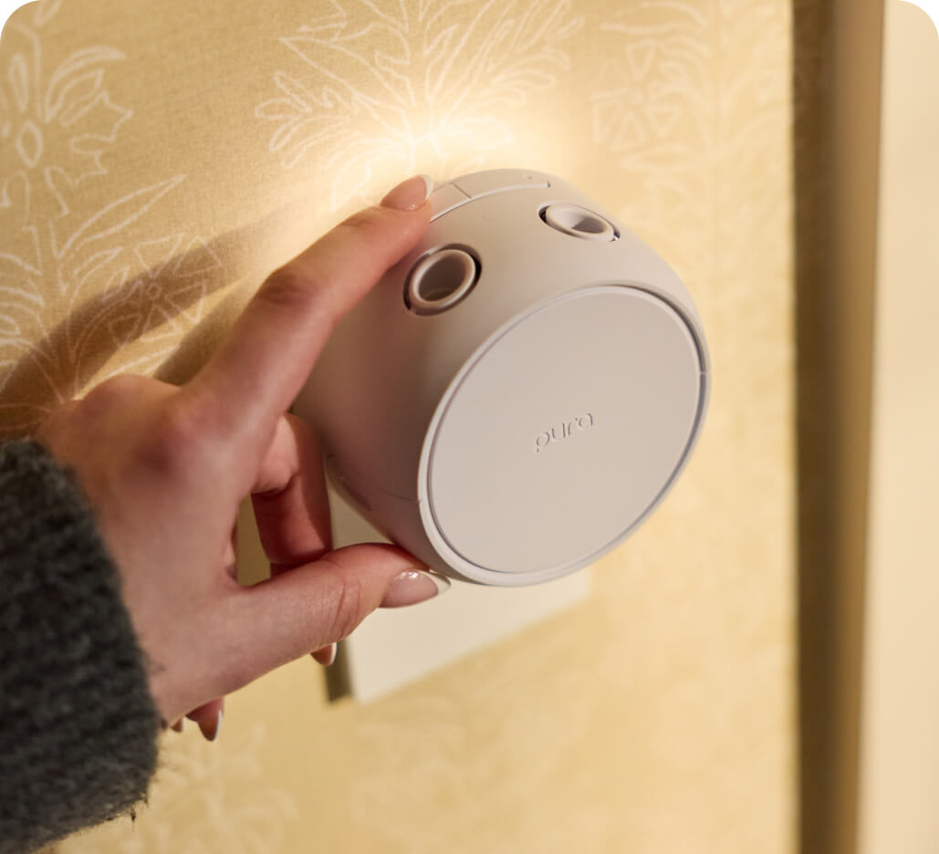 Control your Pura Home in the Pura app or with buttons on the diffuser. Press once to start a 4-hour timer, then press again to adjust intensity—strong, medium, subtle, or off.